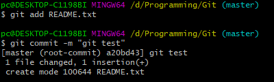 조금 전 만든 파일을 add 명령어 실행 후에 commit 해준다. -m은 'message'의 약자다. '1file change, 1 insertion(+)'가 보이면 성공이다. 첫번째 버전을 방금 만든 것이다.