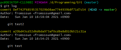 현재 날짜와 시간 및 내용을 추가한 다음에 저장해주고 다시 add와 commit을 해주었다. 이로서 총 두번의 커밋을 한 것이다.